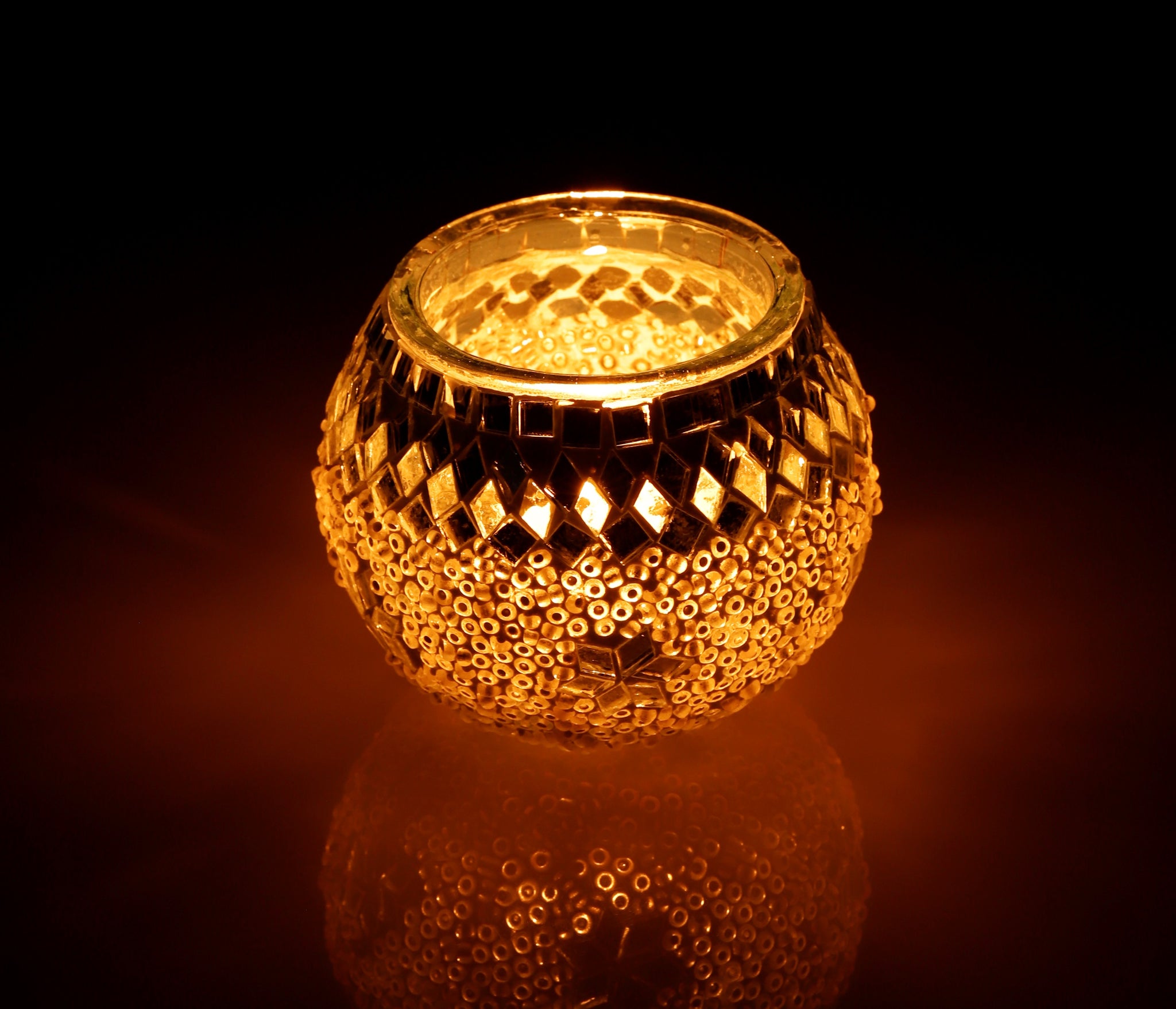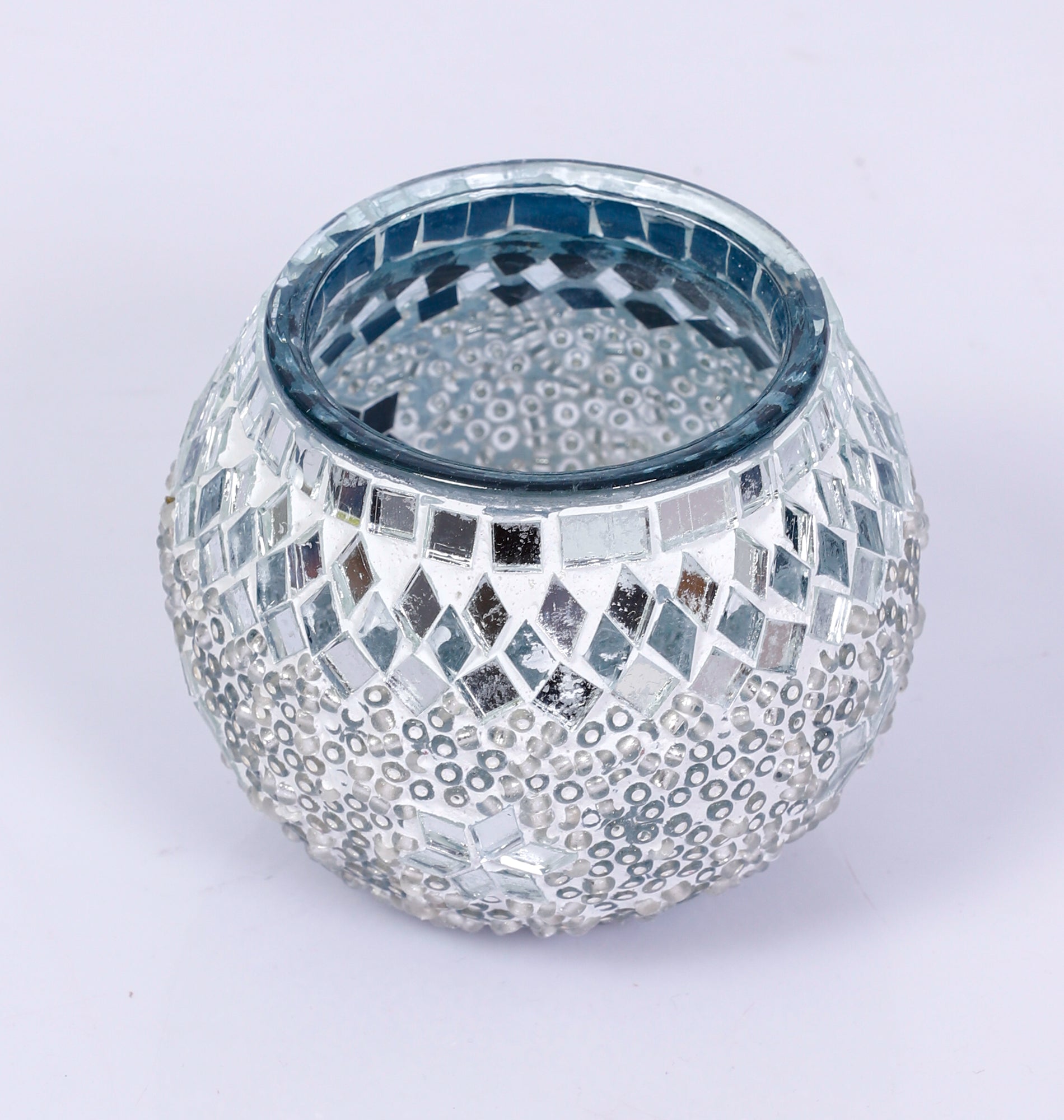 This mosaic candleholder will be gorgeous on a table, any counter top of outside on your deck for a  festive, shimmery candlelight display. In a mosaic of glittering dimension, this mosaic candle holder set glow from within and reflect light to create a crystalline display.