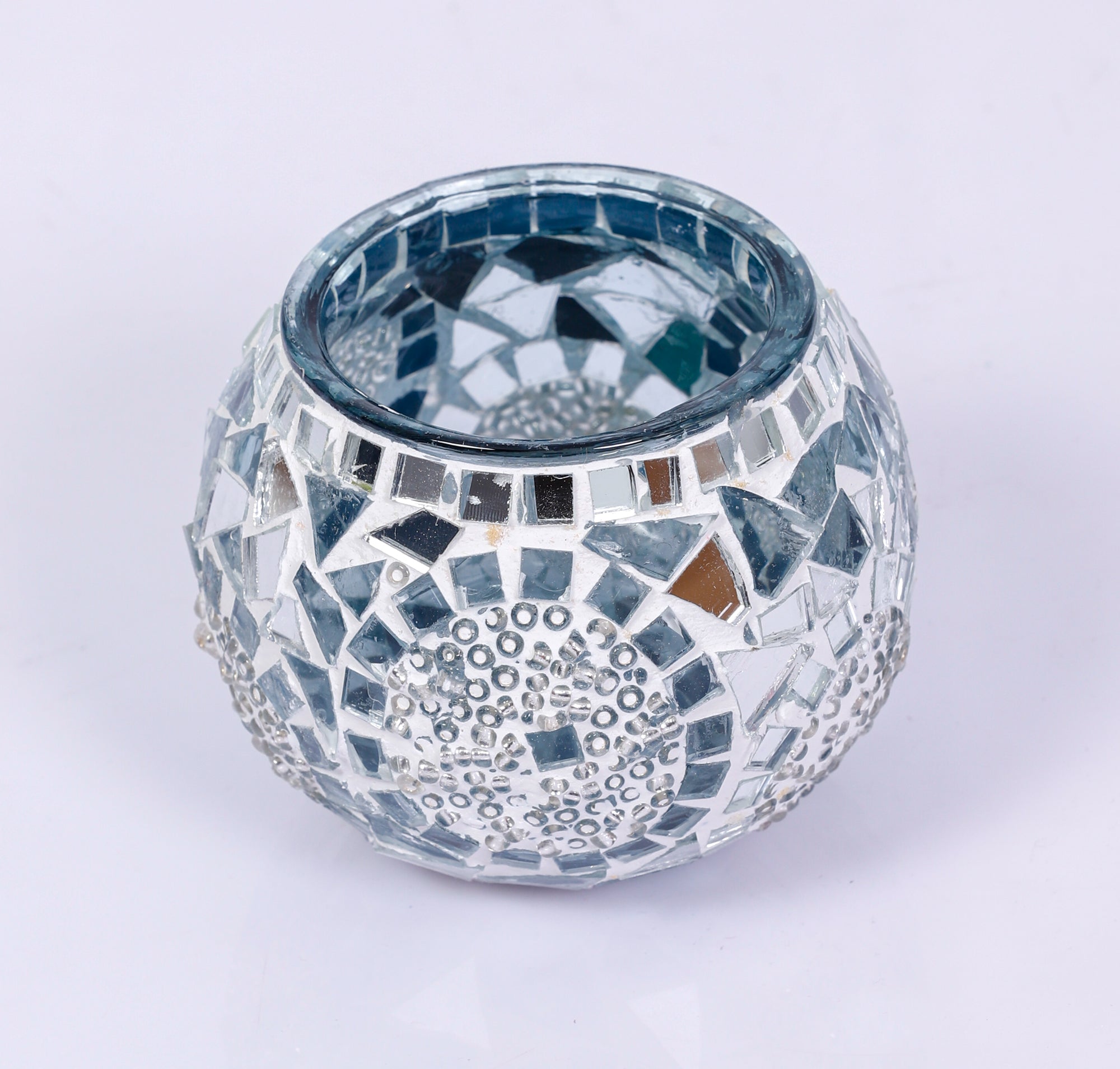 This mosaic candleholder will be gorgeous on a table, any counter top of outside on your deck for a  festive, shimmery candlelight display. In a mosaic of glittering dimension, this mosaic candle holder set glow from within and reflect light to create a crystalline display.